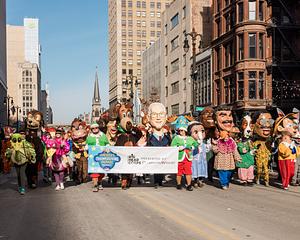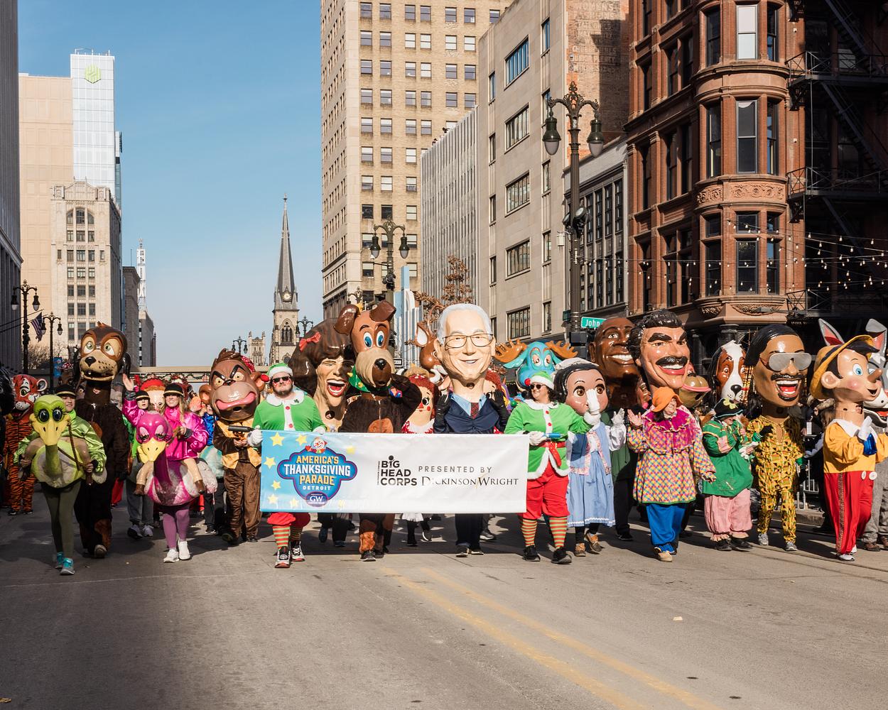 Big Head Corps by Dickinson Wright walking in America’s Thanksgiving Parade, 2022